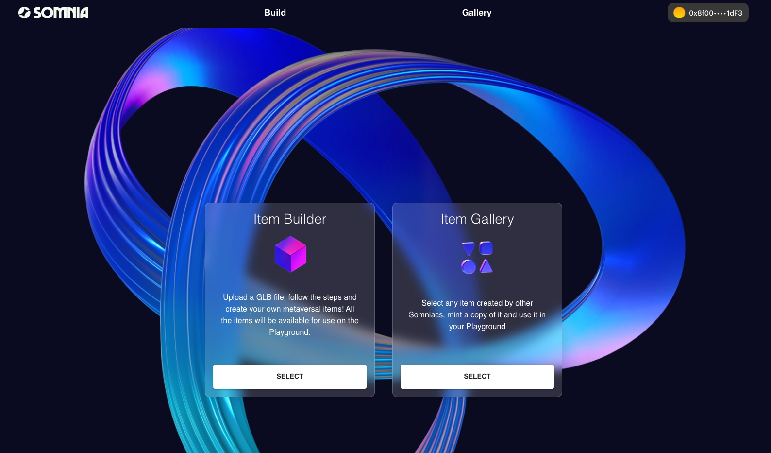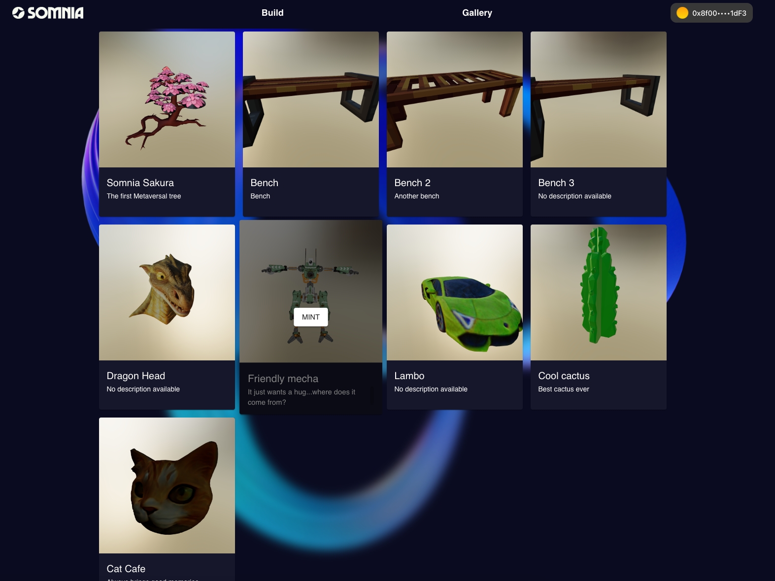 This shows all the items created by users of the Somnia network. If you like any of them, you can click mint. This will create an NFT in your wallet, which you can use in the Playground (see Create your first object for a guide on how to do this).